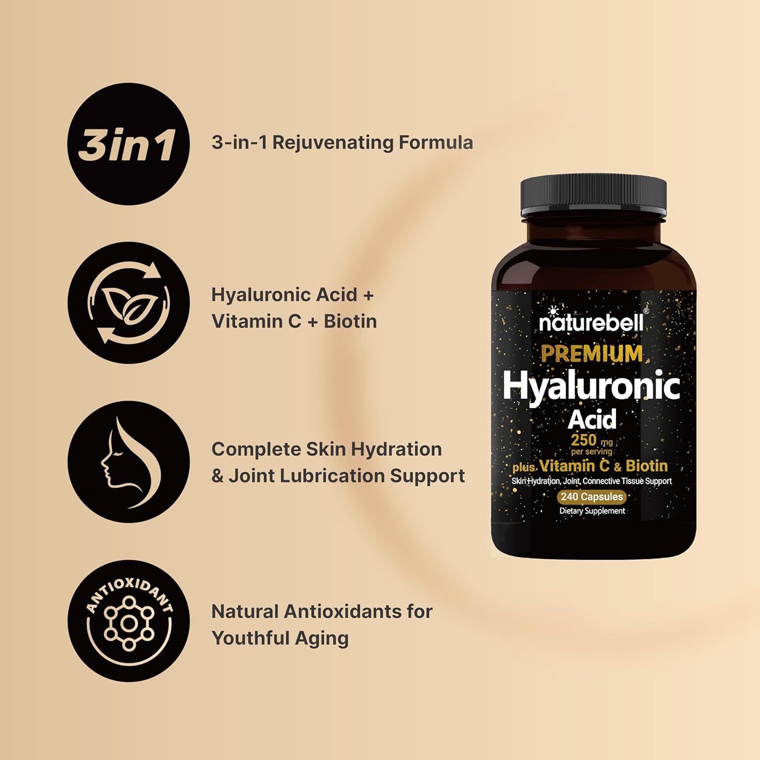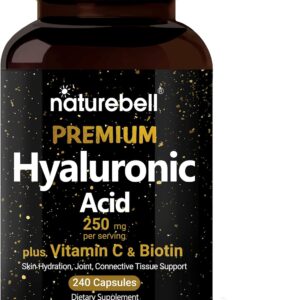 NatureBell Hyaluronic Acid Supplements 250mg | 240 Capsules, with Biotin 5000mcg & Vitamin C 25mg, 3 in 1 Support - Skin Hydration, Joint Lubrication, Hair and Eye Health